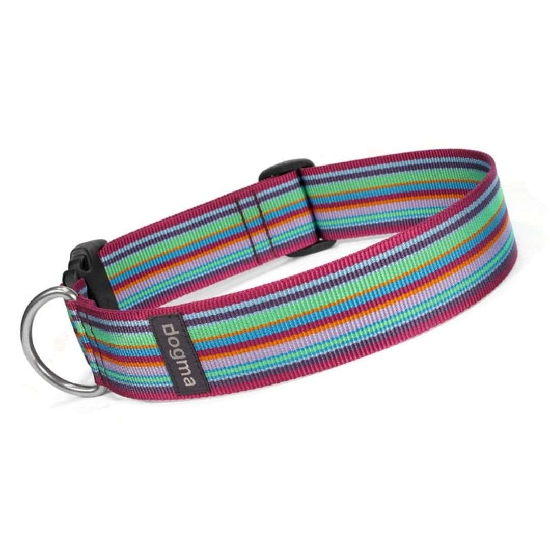 Dogma Stripes hundehalsbånd, er i det smukkeste Nylon og i hele tre farvekombinationer, som hver for sig stråler af glæde og leg.