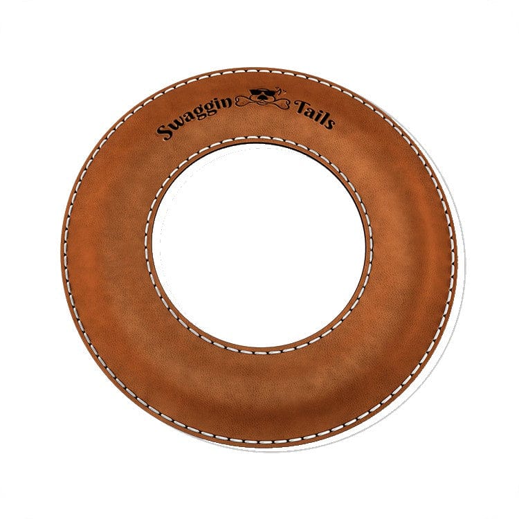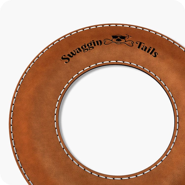 Denne ring i ægte læder er brun på den ene side og sort på den anden. Den kan bruges som en frisbee i haven eller til trækkeleg – det vigtigste er, at din hund har det sjovt.