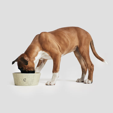 Hundeskåle med smukt design, med prikker, hundeskåle med striber, begge kan bruges som madskål til hund eller vandskål til hund og begge er i keramik.